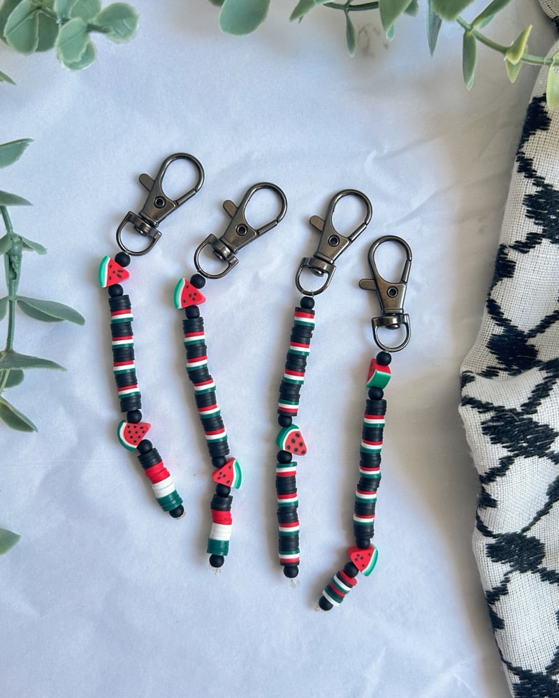 Handmade Palestine-inspired bag charm featuring the Palestinian flag colors and symbolic watermelon bead. A beautiful way to show solidarity β perfect for bags, keys, or gifts. Ethically handmade by Solidarity by Mini Amaanah. π΅πΈπ€